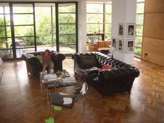 für eine adlerin : neubau eines einfamilienhaus/alsbach/bergstrasse : das langestreckte restgrundstück in extremer hanglage wird von der unter denkmalschutz stehenden sog. ’metzendorfschen Garage’ - einem im grundriss 6 mal 6 meter großen zweigeschossigen altbau mit sehr expressiver dachform - in zwei etwa gleich große teile gegliedert. da der altbau entsprechend den vorgaben der genehmigungsbehörde ’hauptereignis’ der bebaung sein sollte, musste der neubau – der sich als ungleicher Bruder neben dem altbau behaupten sollte, dessen oberkante die traufe des altbau jedoch nicht überschreiten durfte –zwangsläufig auf der größeren, talseitigen grundstückshälfte angeordnet werden, im höhergelegenen gartenteil ist an der südlich spitze der bau einer liebeslaube vorgesehen. wesentliche teile des entwurf sind – neben der denkmalgerechten sanierung und einbeziehung des altbau - die zum tal und zur sonne hin angeordneten großformatigen terrassen und die, der kühle eines solcherart modernen, sehr großflächig verglasten baukörpers begegnende auswahl sehr warmer materialien für die innenraumgestaltung. fertigstellung : 1999, siehe auch : christoph gunser/wohnen am hang/dva/2001 |